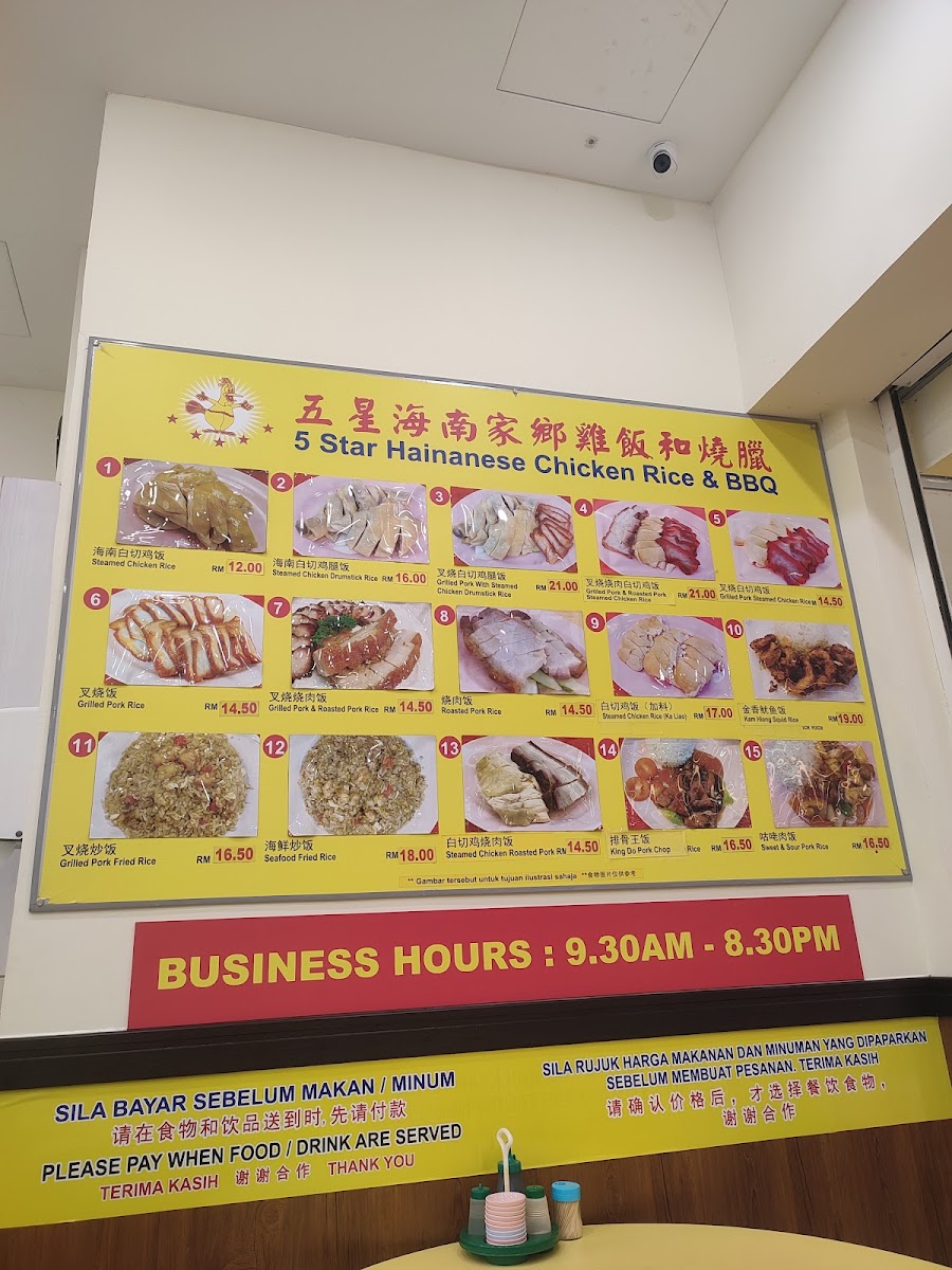 5 Star Hainanese Chicken Rice is a well-known Chinese restaurant located in the heart of Donggongon, Sabah, inside the bustling ITCC Mall. This spot is praised for its signature Hainanese chicken rice, a dish celebrated for its smooth, tender chicken paired with fragrant, perfectly cooked rice. The ambiance is comfortable, with air conditioning and spacious seating making it ideal for a relaxed meal. While their chicken rice stands out, their roasted pork and char siew receive mixed reviews, suggesting room for improvement in these areas. The menu offers more than just chicken rice, presenting a variety of options that cater to diverse tastes. Guests appreciate the efficient, friendly service and the clean, welcoming environment. Though slightly on the pricier side, the quality and taste justify the cost. Whether you're a local or visitor craving authentic Hainanese flavors, 5 Star Hainanese Chicken Rice offers a reliable and satisfying culinary experience worth exploring.